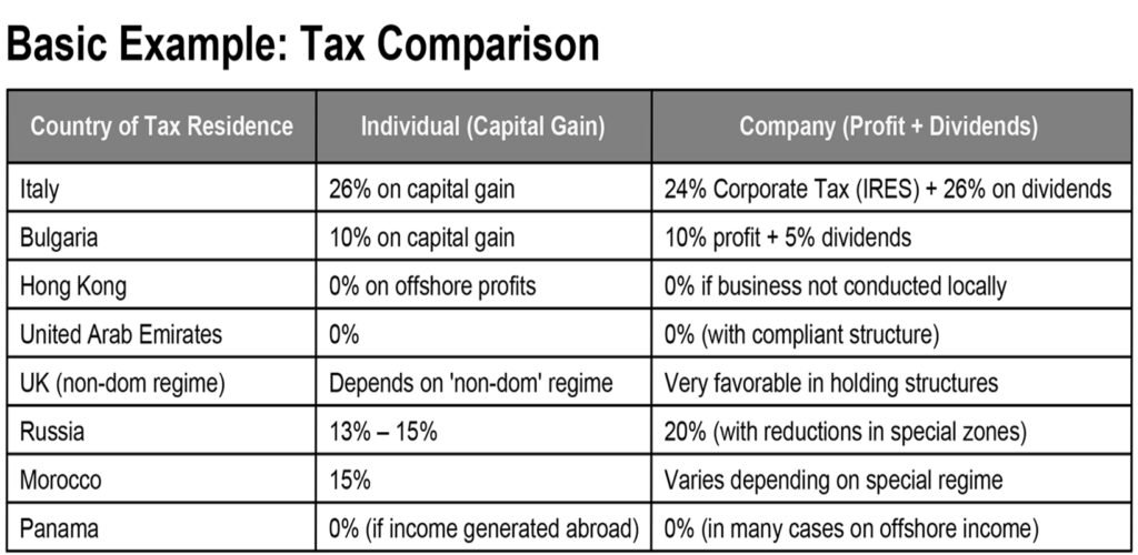 In both cases, profits are taxed according to the laws of your country of tax residence. However, it is possible to adopt more advantageous solutions in a legal and transparent way, thanks to our international experience and the partners we have been working with for years.